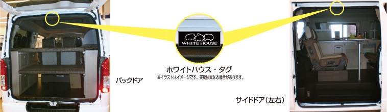 ネットに付いている「ホワイトハウス・タグ」(画像○印)がドア開口上部の中心にくるよう取付けて下さい。(バックドア、サイドドア共通)