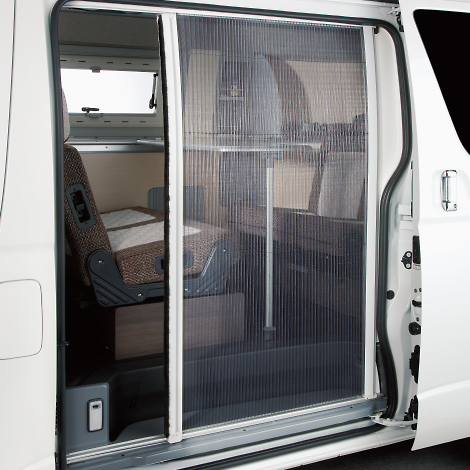 ハイエース200系専用フライスクリーンは、ヨーロッパで絶大なシェアを誇るフライスクリーンメーカーのHORREX社(オランダ)とホワイトハウスが共同開発した業界初!!︎のスライドドア用のスライド式網戸です。